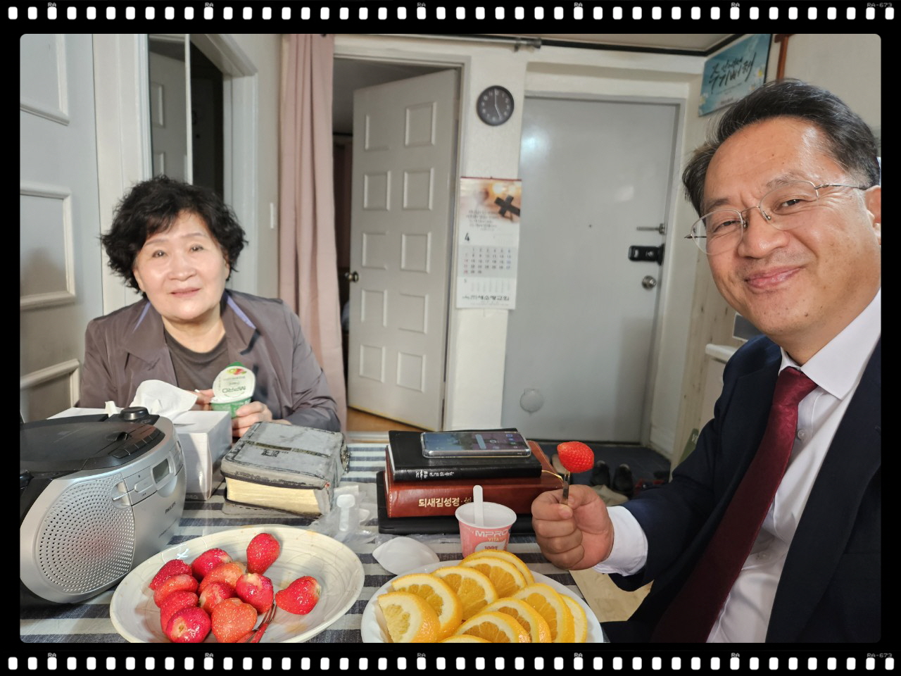 이풍자 권사님댁 심방 하루일과를 오전 5시부터 시작하여 새벽기도하시고 오전에 3시간 일하시고 점심은 늘 친정어머니와 드시고 적당한 오후에 귀가하시어 9시 전에 주무신다는 권사님~~ 바쁘지만 건강하게 잘 지내고 계셔서 넘 감사하고 좋았습니다. 기도제목은 따님 가정이 더욱 성숙한 모습으로 신앙생활하고 더사랑교회의 부흥이 권사님의 기도제목입니다