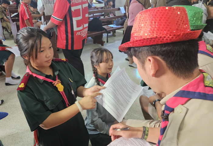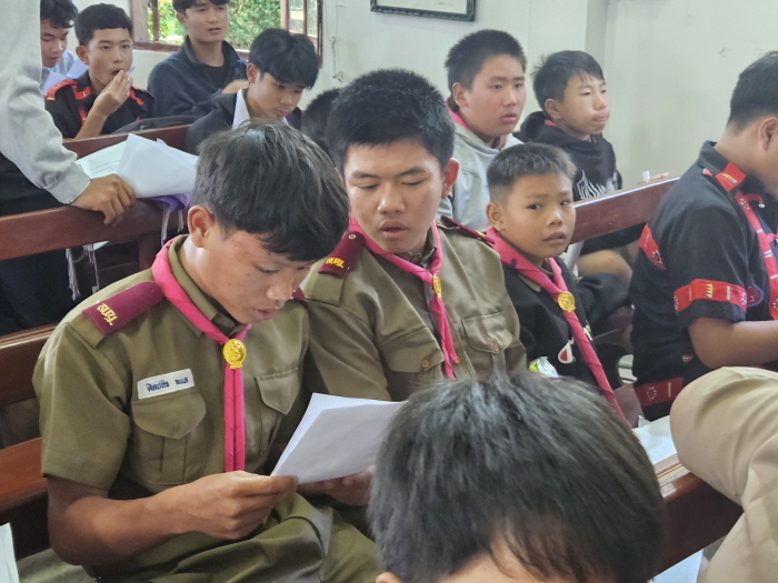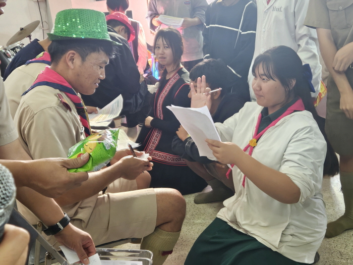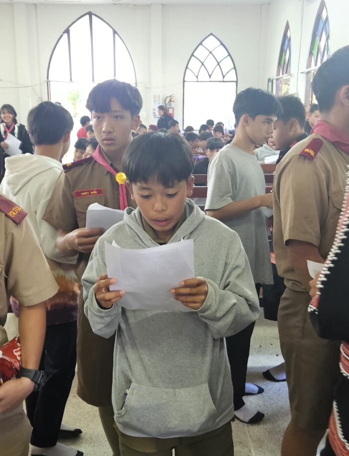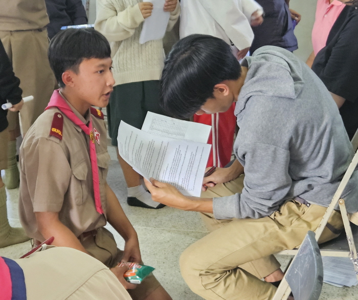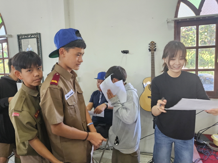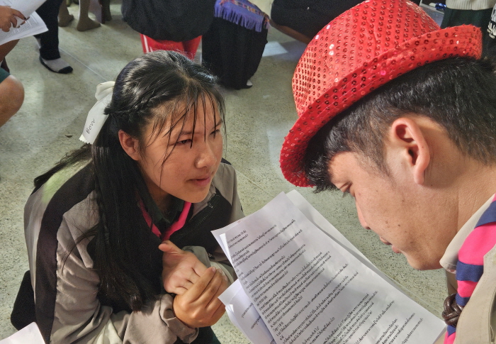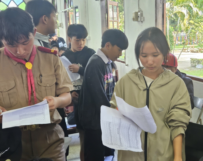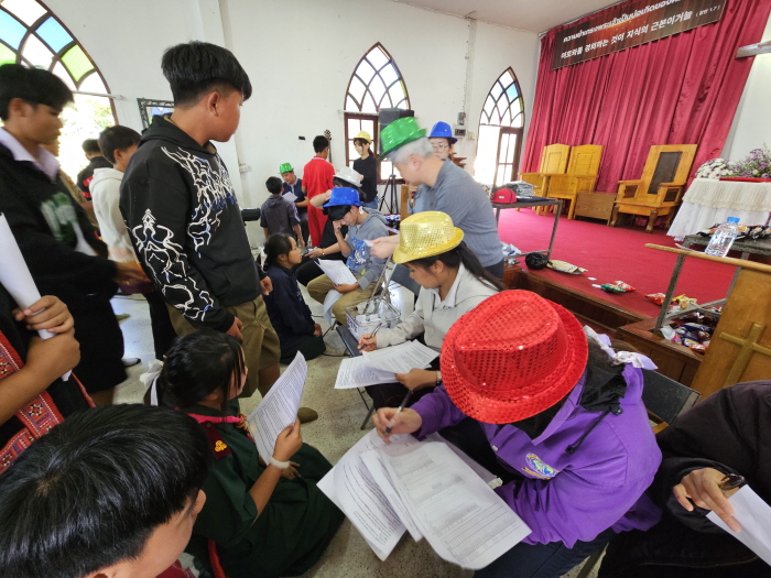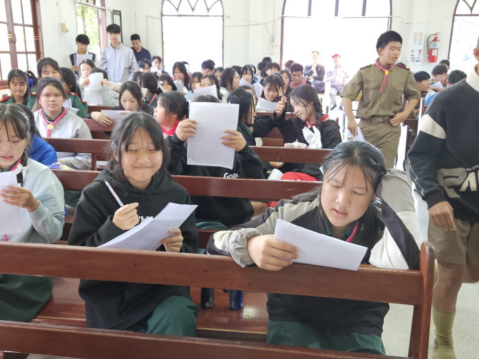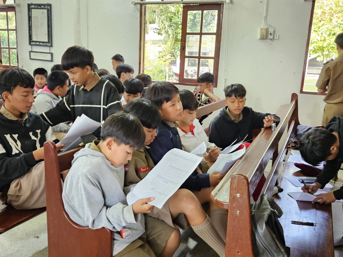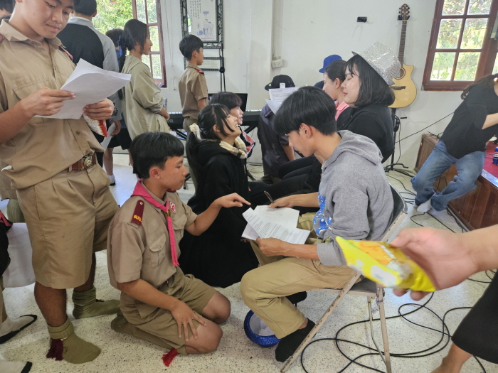 200명의 중고등 태국의 아이들이 열심히 암송하였어요. 과자 간식을 상품으로 주며 게임처럼 하니 아이들이 시간가는 줄 모르게 열심히 암송하였어요. 가랑비에 옷젖듯 말씀을 외우고 또 외우고...암송을 이렇게 재미있게 할 수 있다니 아이들이 누구의 도움없이 열심히 암송합니다